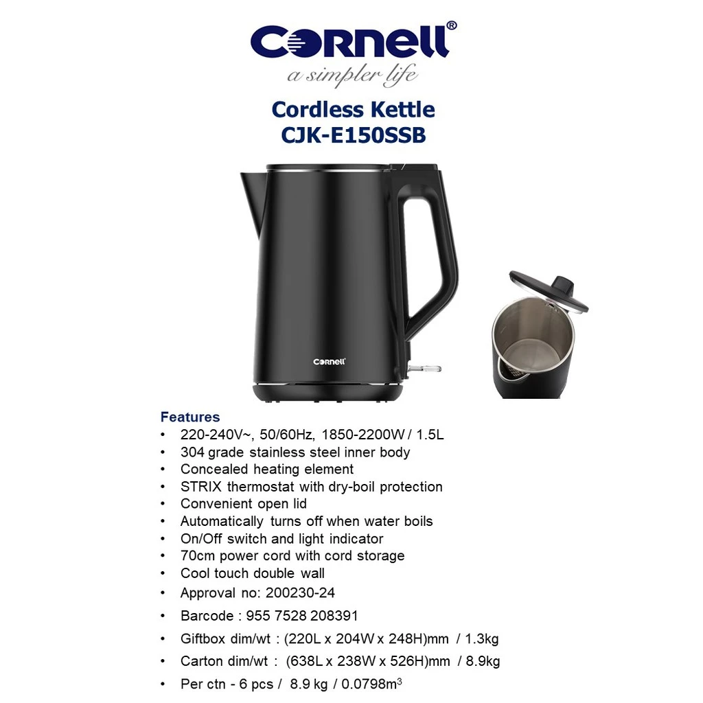 Cornell 1.5L Cool Touch Double Wall Cordless Kettle, with full inner Stainless Steel
