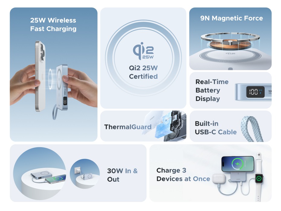 UGREEN 10000mAh Qi2 25W Magsafe Power Bank Wireless Charging Fast charging MagFlow Powerbank Built in Type-C Cable for iPhone 17 Series iPhone 16 Pro Max Qi2.2 Version
